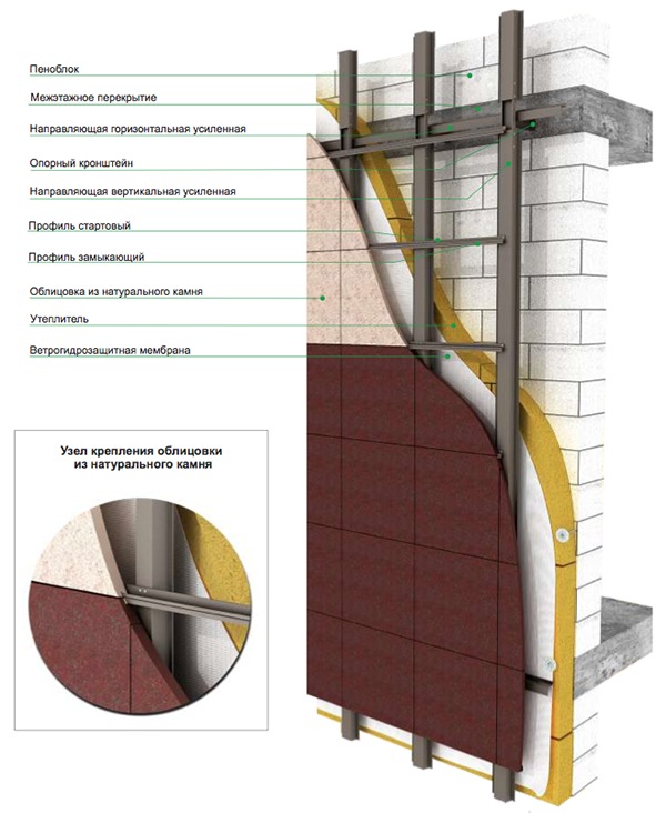 - Благодаря ее жесткости и надежности позволяет крепить натуральный камень большого веса (более 200 кг/м2) на большом относе. В нашем активе имеются реализованные объекты с толщиной камня 70 мм на относе от стены равном 400 мм